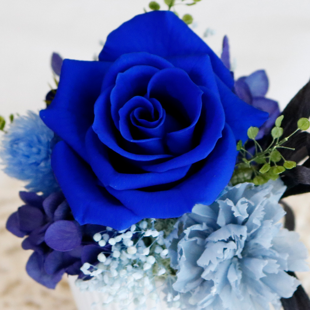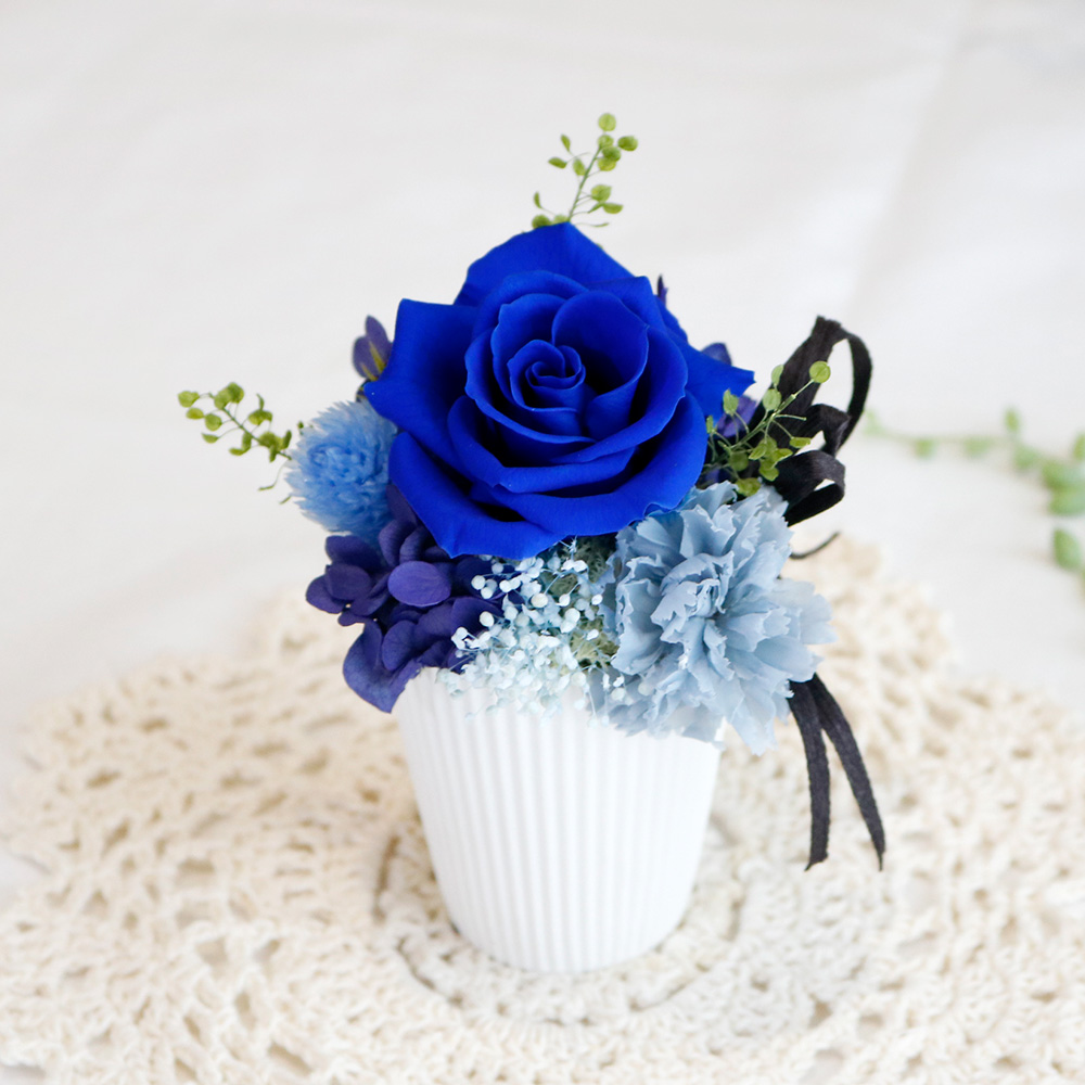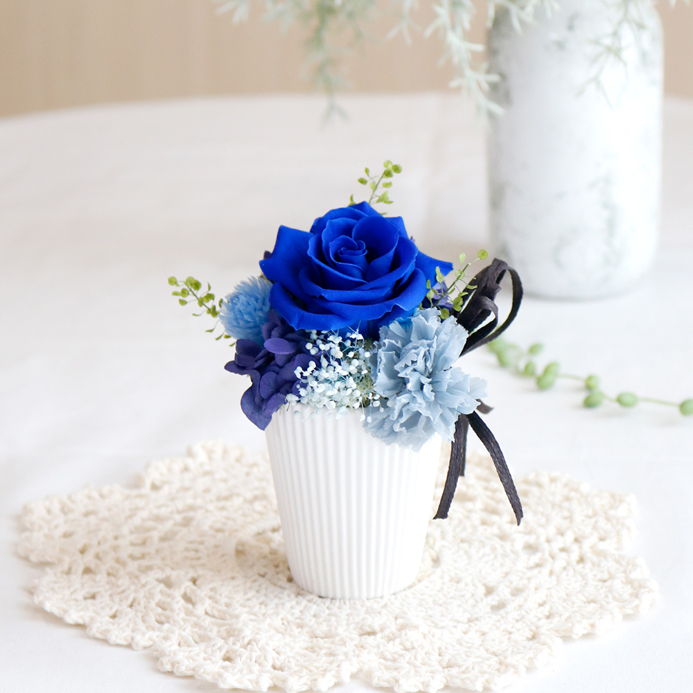 小さなカップに咲く大輪のバラが印象的なプリザーブドのアレンジメント。手のひらにちょこんと乗るくらいの小さなサイズですが、美しく咲き誇るバラとそれを囲む可愛い草花たちがカップいっぱいに溢れとても華やかで、存在感のあるアレンジメントです。 ブルーのバラの花言葉は 「奇跡」「夢かなう」「神様の祝福」 送別、出産、お見舞い、お礼、お誕生日、記念日、結婚祝い、卒業、お供え、など様々なシーンでお贈り頂けます。皆に愛される可愛いローズカップをぜひ一度大切な方へ贈ってみませんか?