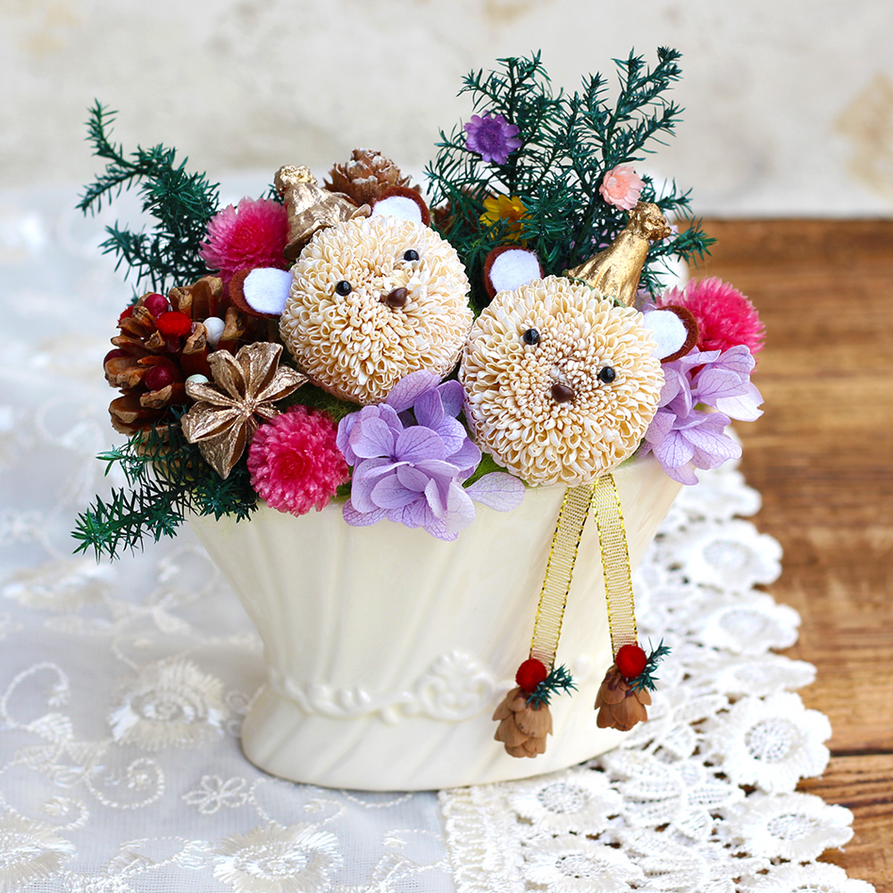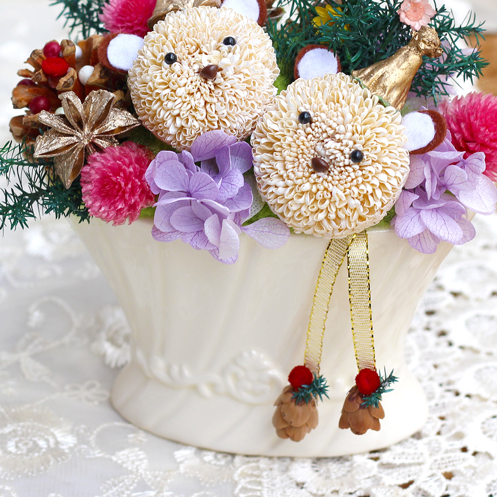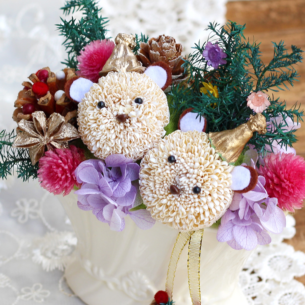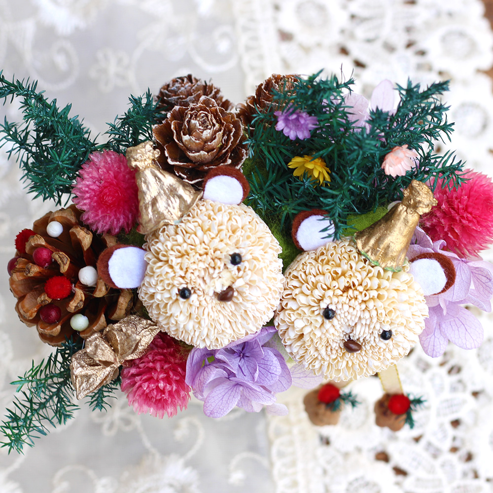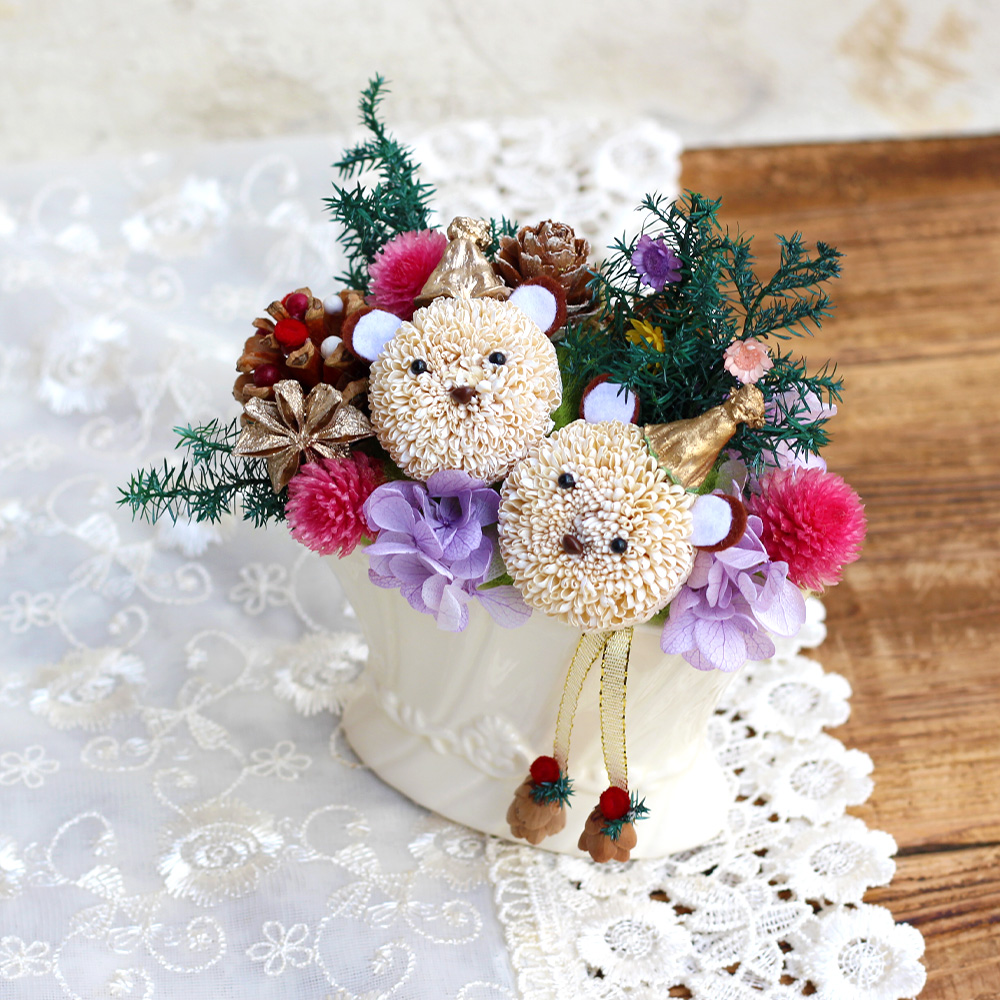ポンポンマム、アジサイ、千日紅、スターフラワー、ヒムロスギ、松かさ、カラ松、ハス、タマラックコーン、アニス ※入荷状況により、資材の種類や色みが写真とは異なる場合がございますが、イメージを損なわずお作りさせていただきます。