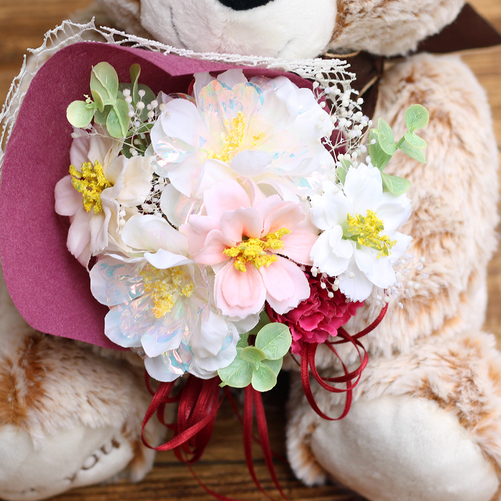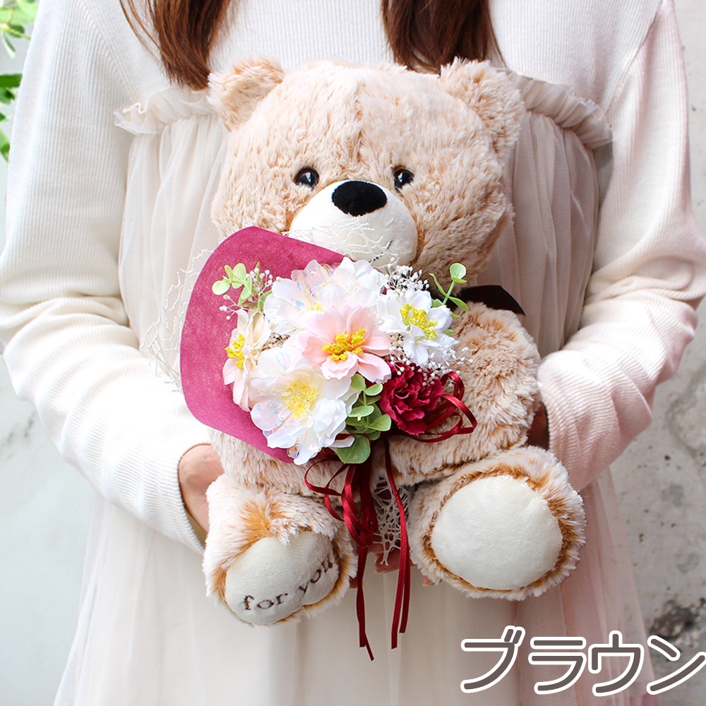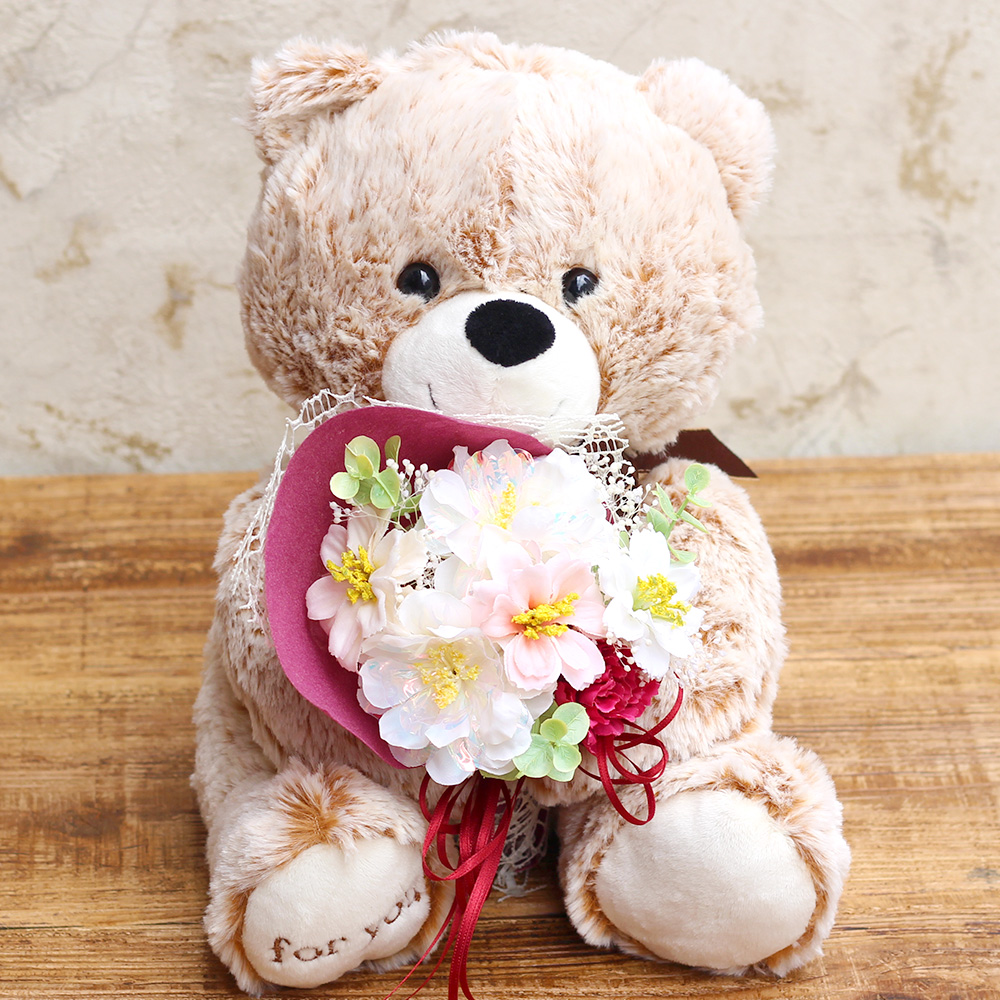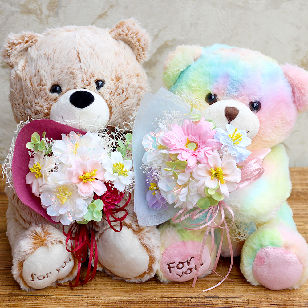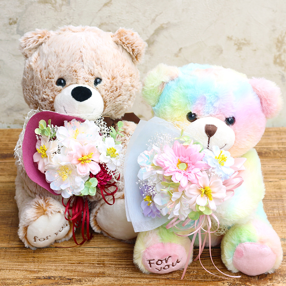 抱きしめたくなるようなキュートクマが、あなたの気持ちを伝えてくれます。モフモフとした毛並みと表情が愛らしい、「For you」の刺繍がチャームポイントのベアが花束を持つ姿にほっこり。出産のお祝いや、お誕生日・発表会などでのちょっとした贈り物としても人気です。お部屋に飾るだけでメルヘンチックな雰囲気になるので小さなお子様へのプレゼントにもぴったり!優しい色のベアとお花に想いを込めて、あなたからの気持ちを伝えてみませんか?