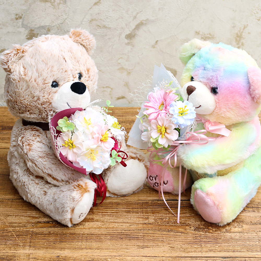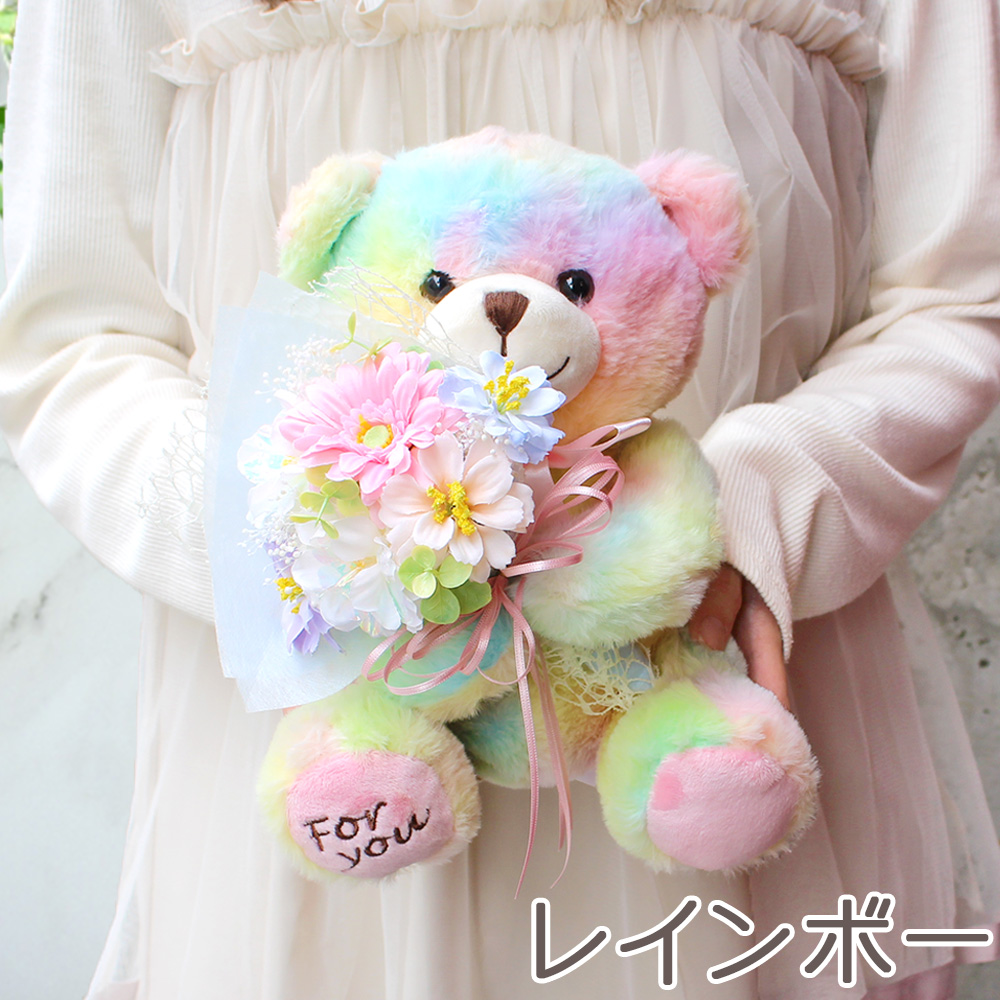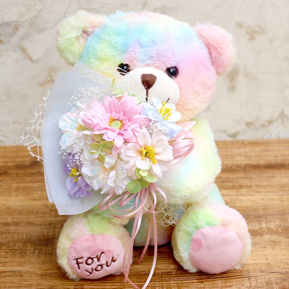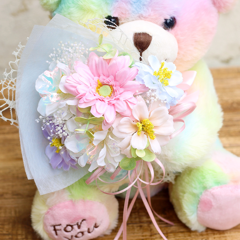 ※こちらのかすみ草以外のお花は、アーティフィシャルフラワー(生花をリアルに再現し、生花にはない美しさを表現した造花)で作られています。クマの顔や形、レインボーの色合いは1体ずつ異なります。写真と全く同じではございませんのでご注意ください。※こちらの商品はクリアケースに入れてお届けします。