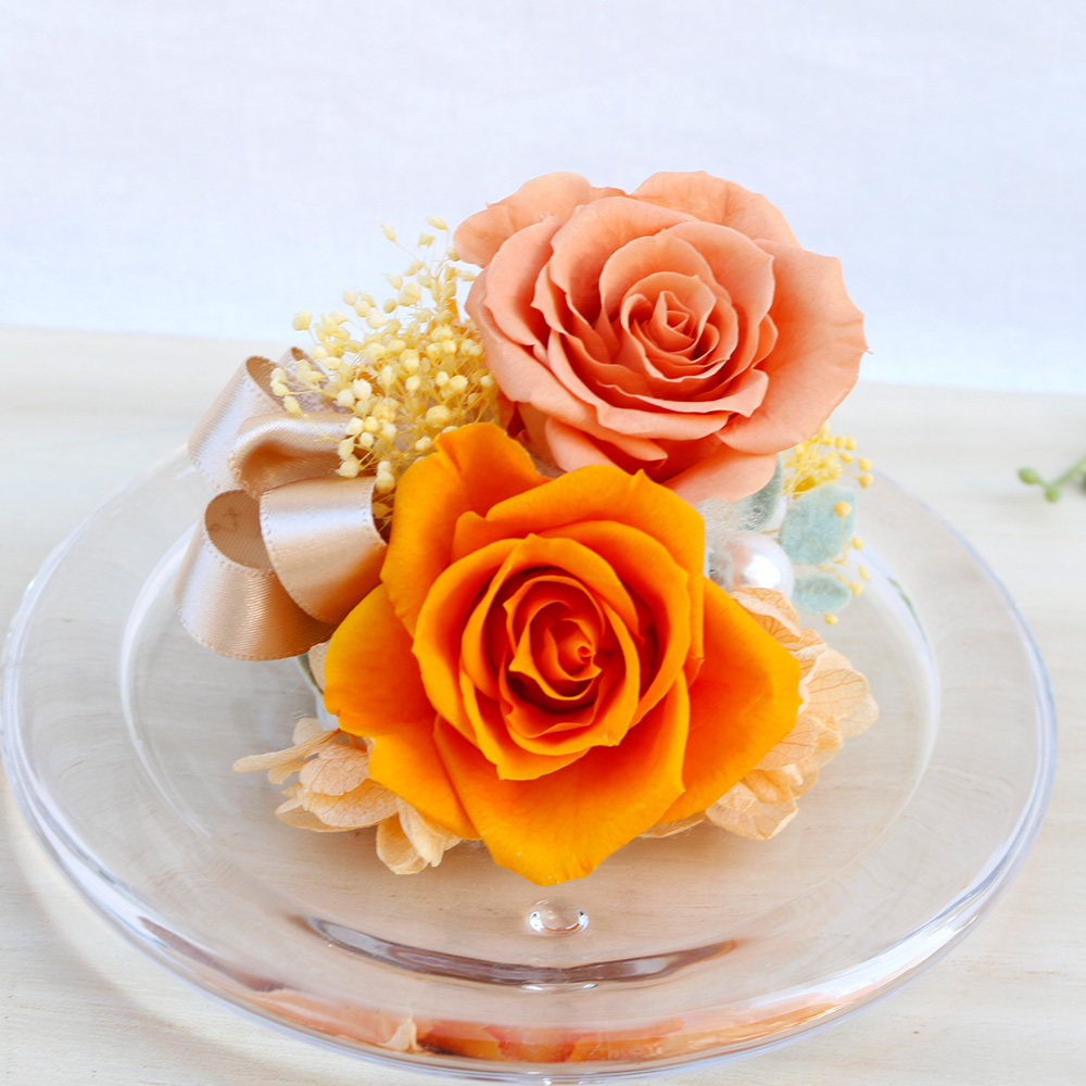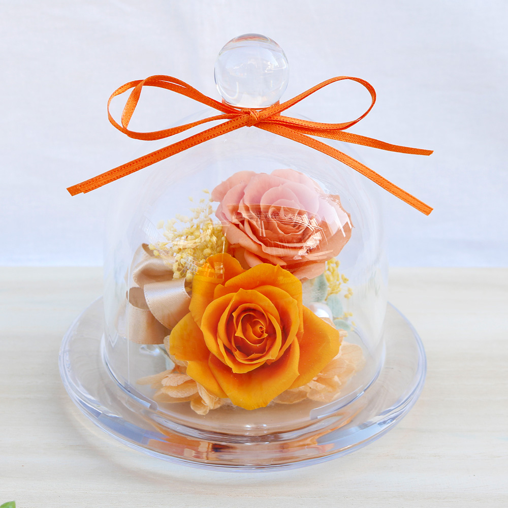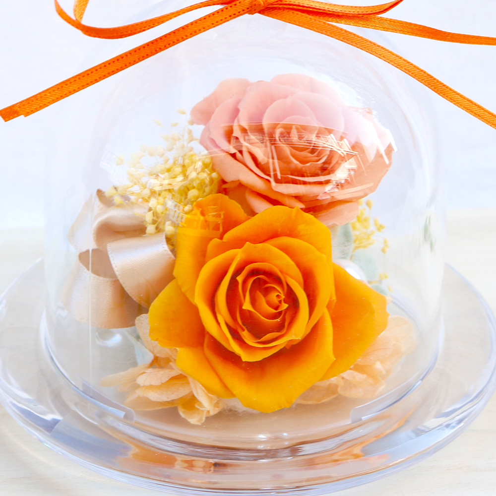 明るいビタミンカラーのお花を閉じ込めたガラスドーム。パッと華やぐオレンジ色のバラをメインに、楽しげな小花をたくさん詰めました。繊細なガラスドームはプリザーブドフラワーをほこりや湿気から守ってくれるので、玄関やリビングなどお好きなところに飾ることができるのも人気の理由です。家族や友人の誕生日や、「これからもよろしくね」の気持ちを込めた結婚祝いのギフトにもおすすめの一品です。