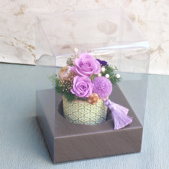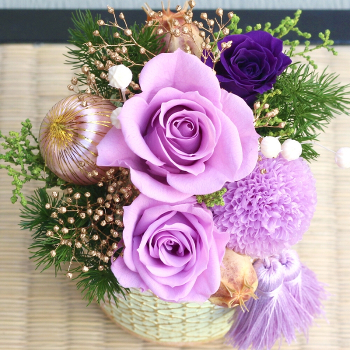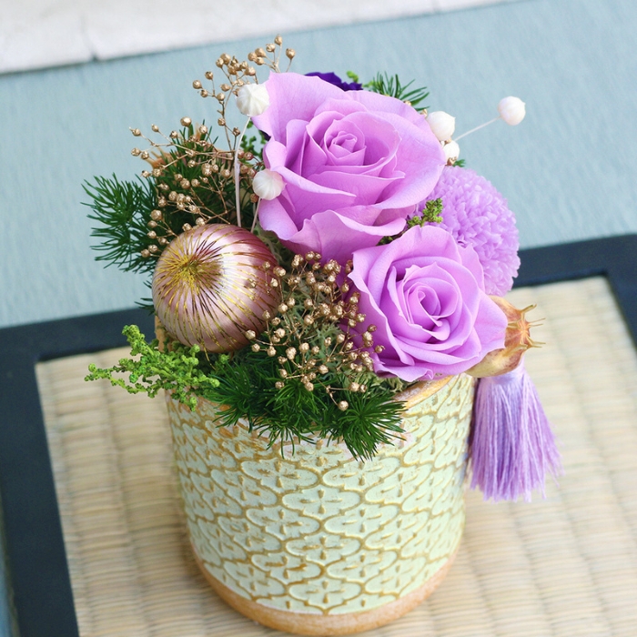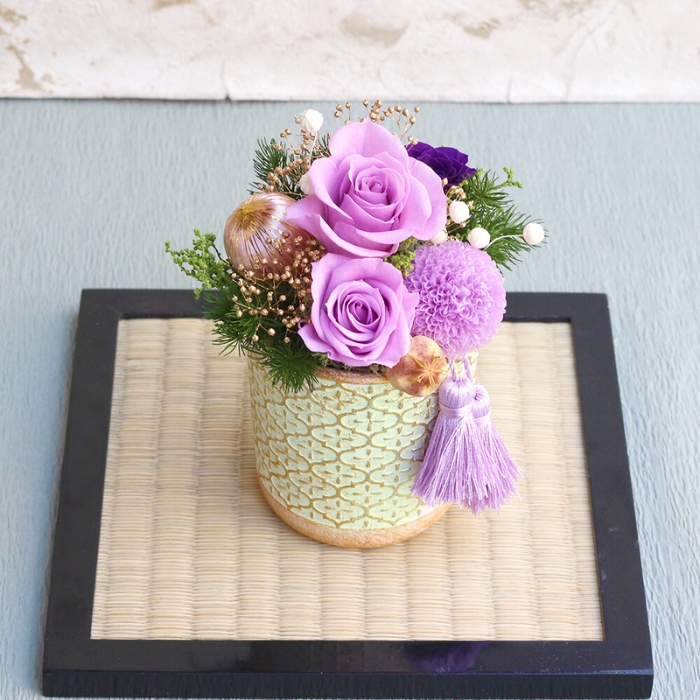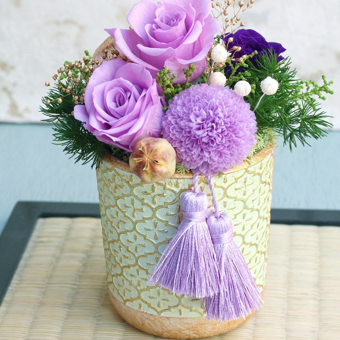 プリザーブドフラワーのマムの花や和テイストの小物を使ったお祝いごとに喜ばれるアレンジメント。古稀(70歳)や喜寿(77歳)などの長寿を祝う色の一つでもある紫は、華やかにして美しくお部屋を飾ってくれます。プリザーブドフラワーは水やりの必要がありませんので、お手入れの負担も少なく長く飾っておけることから年配の方へのプレゼントにも人気です。美しの和を大切な方への贈り物にいかがでしょうか。
