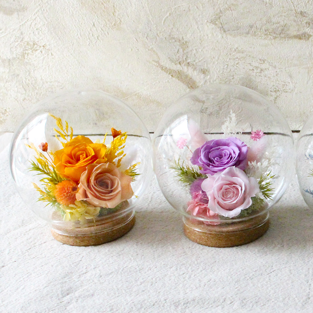 人気のガラスドームにアレンジしたプリザーブドフラワー。お花をぎゅっとガラスドームに閉じ込めました。 清潔感がありナチュラルなアレンジは、女性にも男性にもお贈り頂けるおしゃれなデザイン。お部屋のインテリアに合わせやすく、素敵な贈り物になります。お供え花にもおあすすめです。カジュアルで気軽に贈れるので、送別やお誕生日の定番ギフトはもちろん、母の日や記念日のプレゼントにもぴったり♪お花がドームに包まれていますのでプリザーブドフラワーにほこりや傷がつく心配もなくお飾り頂けます。お友達や家族への「いつもありがとう」のプレゼントにいかがですか?