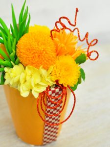 黄色の丸い花と赤い水引飾りのアレンジメント