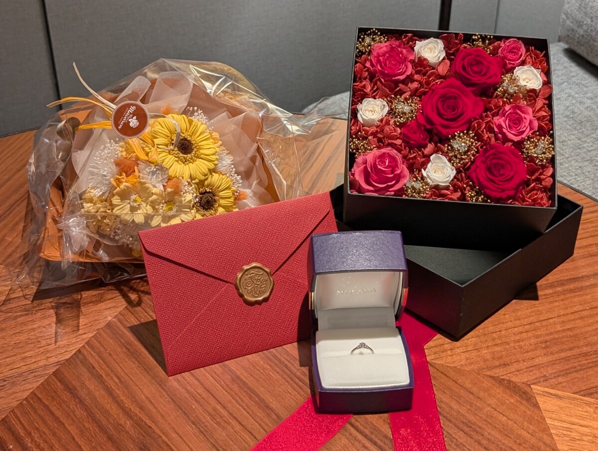 大切なプロポーズの日にお渡しするボックスアレンジとブーケのオーダーいただき、お客様より素敵なお写真をお送りいただきました!(掲載許可済)