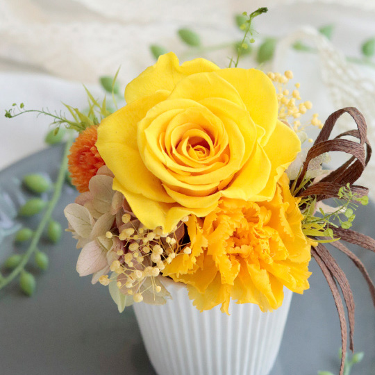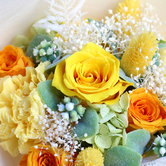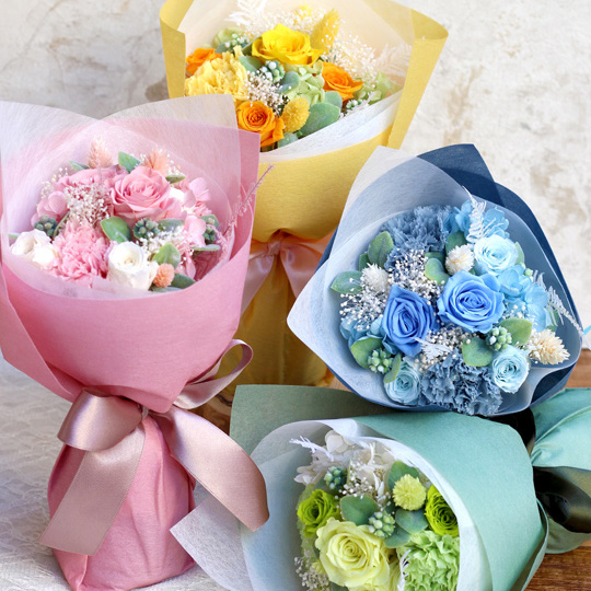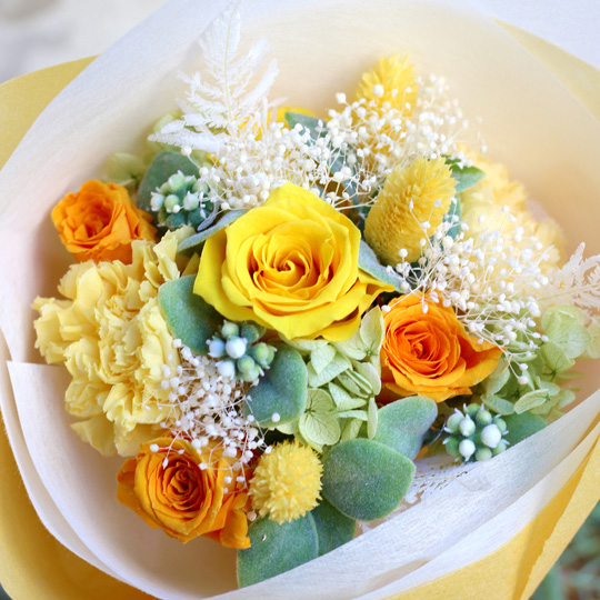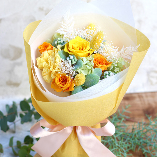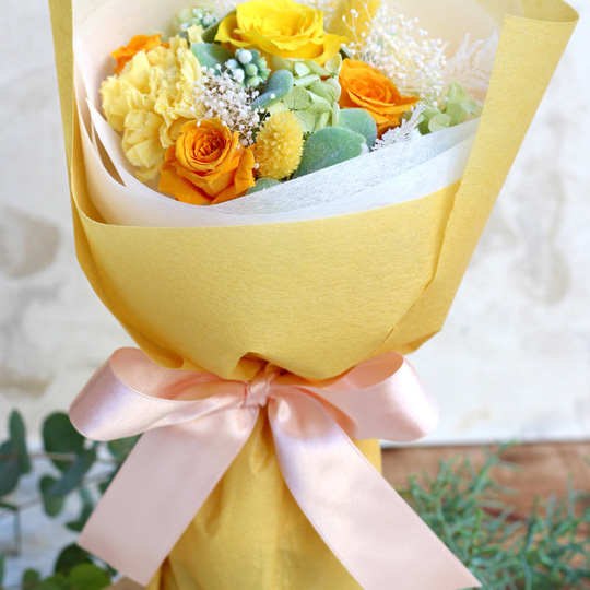 元気も一緒にプレゼント出来るような明るい雰囲気の花束は男女問わず贈りやすい色合いで、記念日やお誕生日など大切な日のプレゼントにおすすめです!花瓶が無くても自立するスタンドタイプの花束ですので、そのままお部屋に飾っていただくことができ、普段お花に親しみのない方にも嬉しいフラワーギフトです。送別会や卒業式などのサプライズプレゼントとしてもぴったり。大切な方へのプレゼントに元気なビタミンカラーの花束はいかがでしょうか?