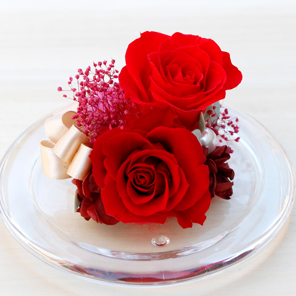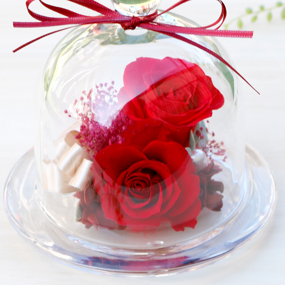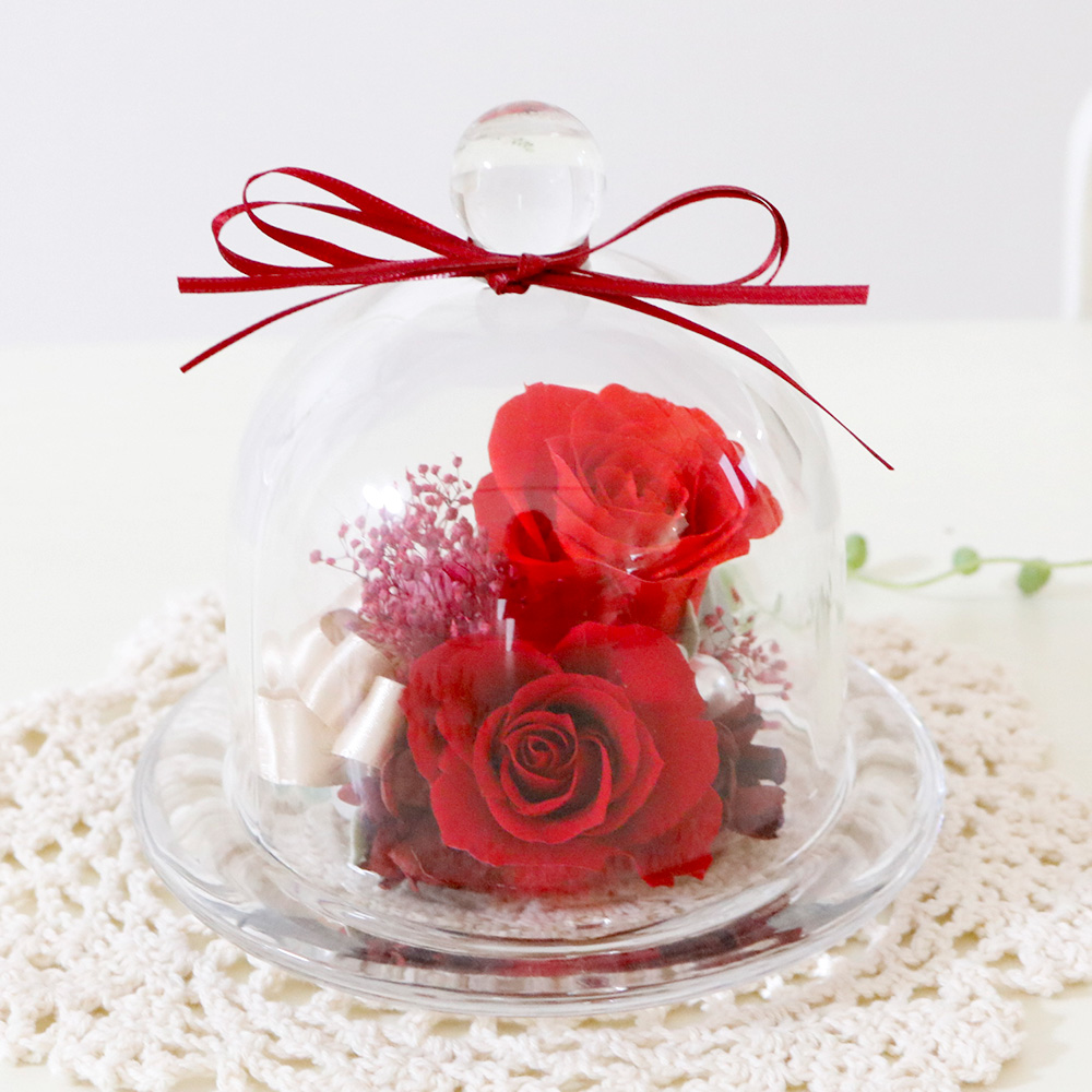 情熱の赤いバラを閉じ込めたガラスドーム!繊細なガラス製の花器はプリザーブドフラワーを湿気やホコリから守ります。愛らしい赤バラのアレンジはお友達や恋人の誕生日祝いにもおすすめ。インテリアとして飾りやすいので、引っ越し祝いや「新天地でもがんばってね」のエールを込めた送別のギフトにも喜ばれます。玄関や子供部屋・デスクの華やぎなど、気軽に飾れるミニギフトです。
