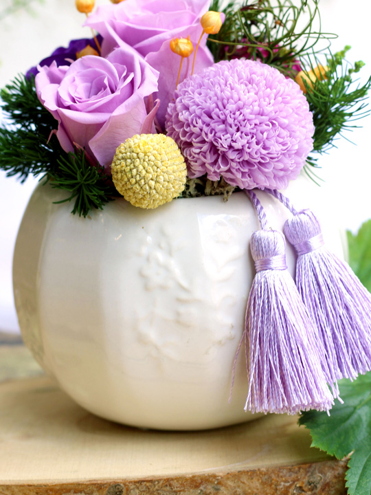 プリザーブドフラワーのマムの花や和テイストの小物を使ったお祝いごとに喜ばれるアレンジメント。古稀(70歳)や喜寿(77歳)などの長寿を祝う色の一つでもある紫は、華やかにして美しくお部屋を飾ってくれます。プリザーブドフラワーは水やりの必要がありませんので、お手入れの負担も少なく長く飾っておけることから年配の方へのプレゼントにも人気です。美しの和を大切な方への贈り物にいかがでしょうか。
