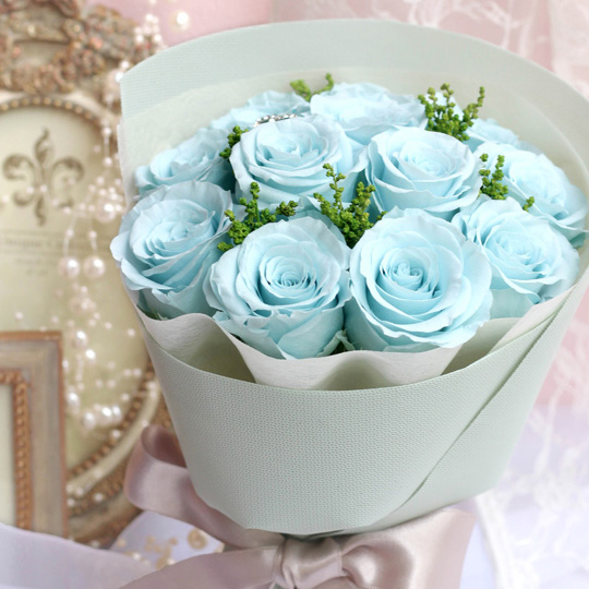 スマートにプロポーズを決めた後は、その時の想いをいつまでも楽しんでいただけるよう、自立してアレンジメントのように飾れるように作った当店特製のプリザーブドフラワーブーケ。